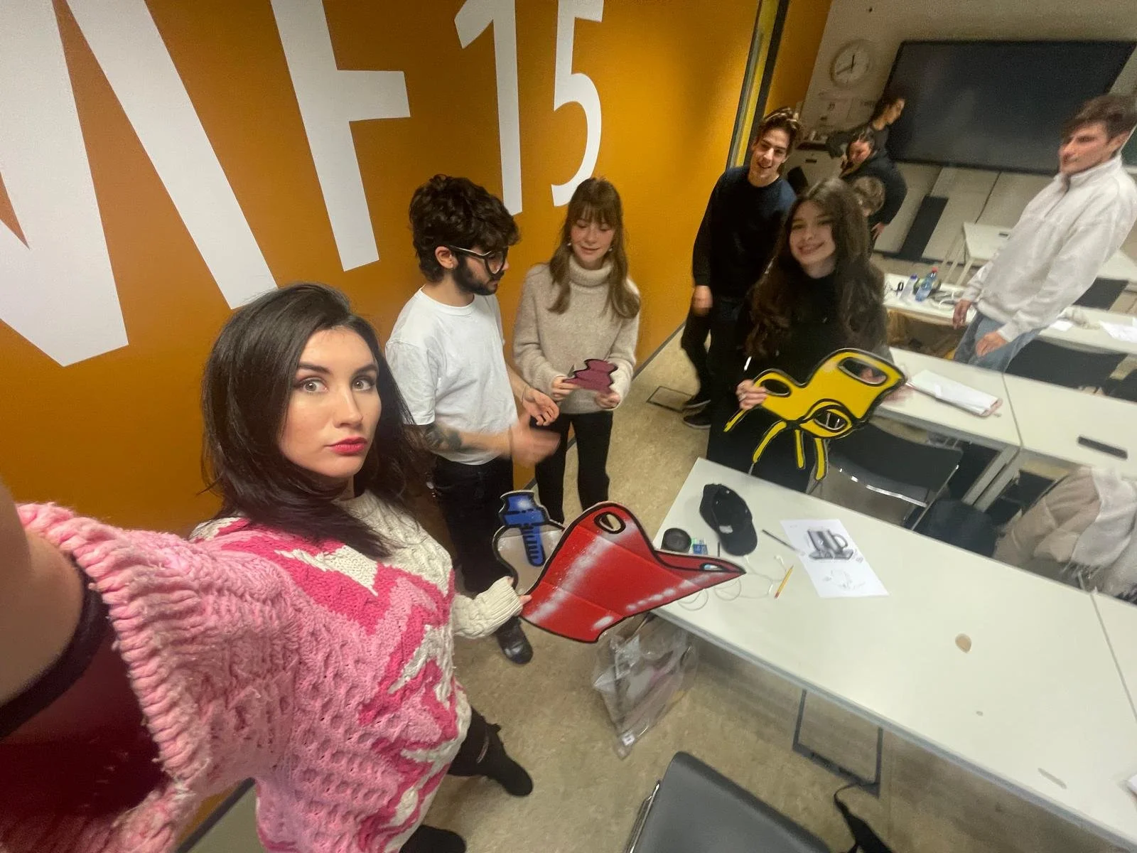 Image 1: Photo with my course group from Trends and Forecasting after a theatrical presentation - Image 2: First workshop session with clients during my internship with de plannenmannen