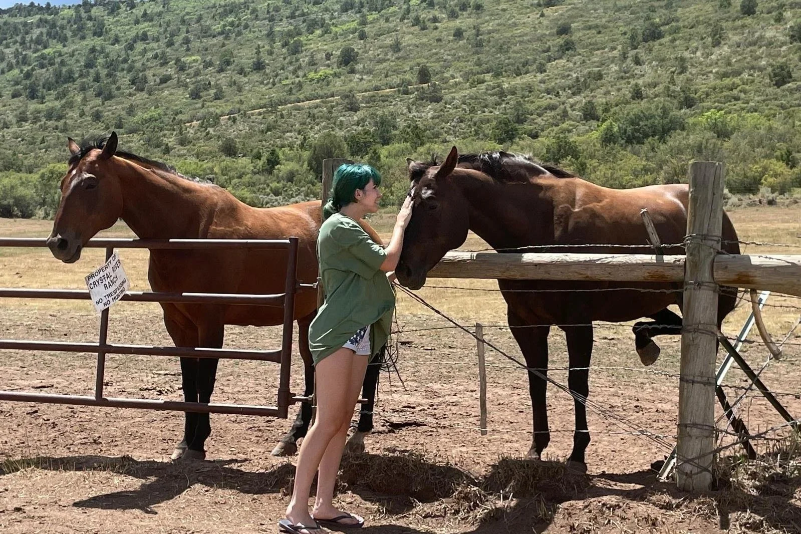 Image 1: Saying hi to horses in my hometown - Image 2: Skiing with my Mom